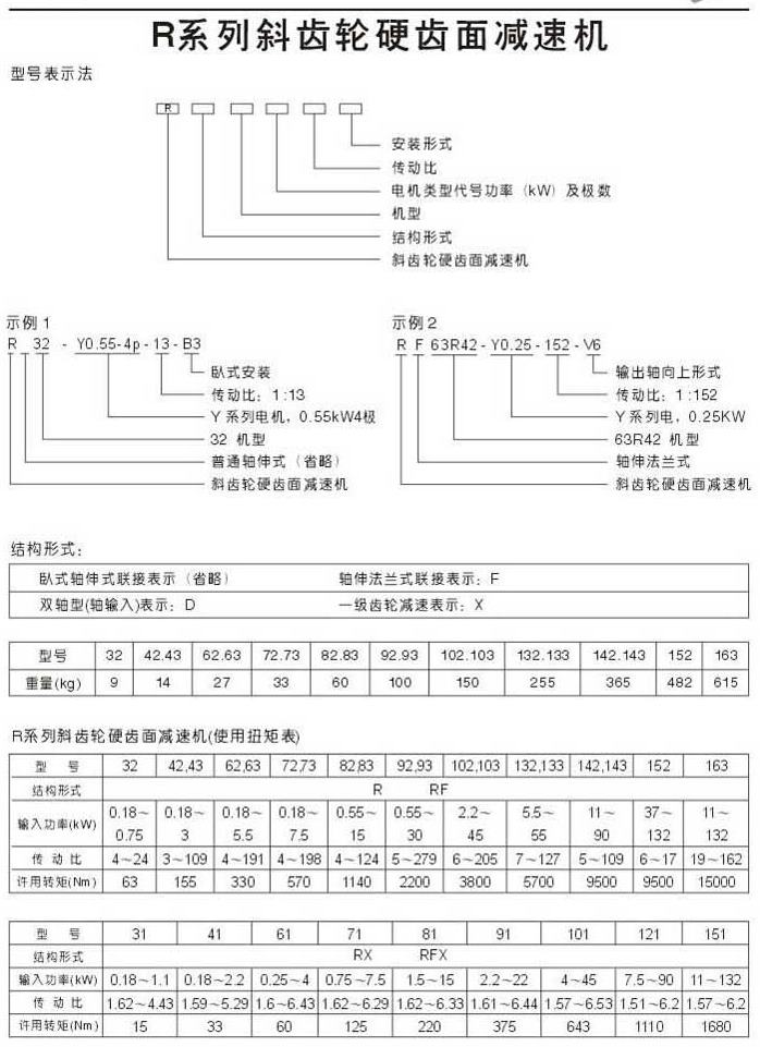 R系列斜齒輪硬齒面減速機(jī)型號表示法結(jié)構(gòu)形式使用扭矩表